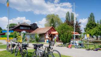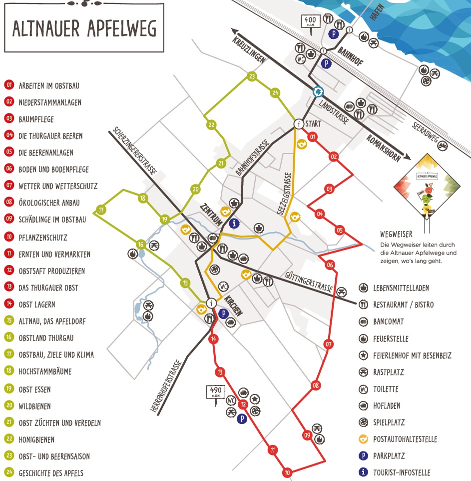 The red route is four kilometers long and takes about two hours on foot or one hour by bike. It runs east of Altnau and focuses on the work of fruit growers.