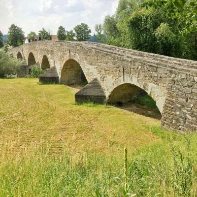The eight-bay old Thur Bridge crosses the Thur southwest of the town center of Bischofszell and is the longest preserved natural stone bridge in Switzerland. It bears the name "crooked bridge" because its ground plan has several kinks so that the piers could be anchored on the Nagelfluh rocks in the river bed.