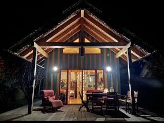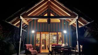 The bathhouse is divided into two floors. The upper floor is used for sleeping with two beds (double and single bed), the lower floor has a bathroom with shower and WC.