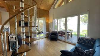 A bright kitchen adjoins the cozy living room with a Swedish stove, sofa bed and small table. Guests can enjoy the view over the lake while the fire crackles in the stove.
