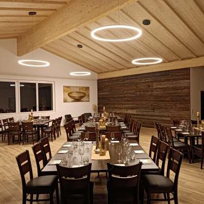 The modern event room at the Engels-Früchtehof offers space for up to 70 people. It has first-class equipment. Complete seating, spacious tables, projector screen with projector and crockery are available. For those who want to do their own cooking, there is a great catering kitchen equipped with a buffet, induction hobs, plate warmer, gastro steamer, fridge, dishwasher, refrigerated counter, coffee machine and a selection of drinks. An attractive covered outdoor terrace with a picturesque view of Untersee and Hohenklingen Castle invites you to take a break and enjoy your meal. Lots of wood creates a cozy atmosphere. The Engel family offers vegetables and fruit from their own production for use in their farm store. The third-generation family business is also happy to organize an aperitif with a cold platter as well as decorations and floristry. On request, the Früchtehof can also organize catering with a regional party service. Guests are also free to bring their own catering.