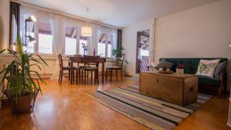 The three-room apartment is equipped with a kitchen, a separate WC, a bathroom with shower and bathtub, two bedrooms, one with a double bed, one with two single beds, and invites you to relax and enjoy. (Maximum occupancy: 5 persons)