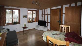 The apartment is located in a former farmhouse and is partly original with timber-framed walls and beams. The house is situated in a rural setting and offers a wonderful panoramic view over Lake Constance.