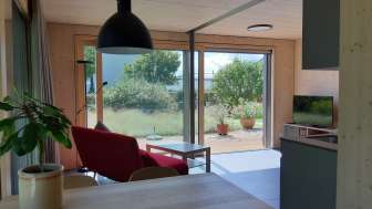 The pretty little wooden bungalow is located in a green single-family home garden in the quiet Bergli district of Arbon. The historic old town or the idyllic shores of Lake Constance can be reached on foot in around fifteen minutes.
