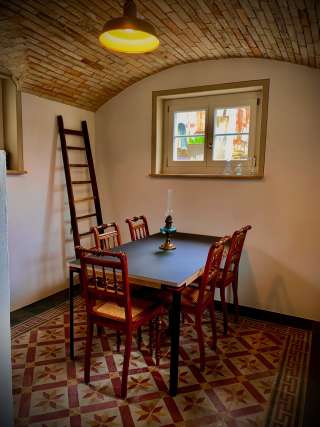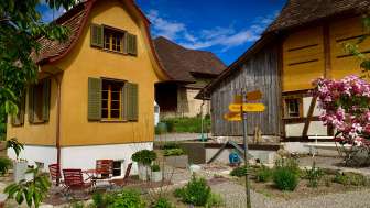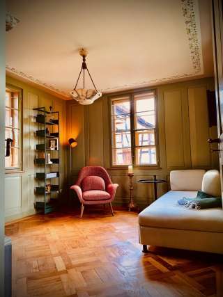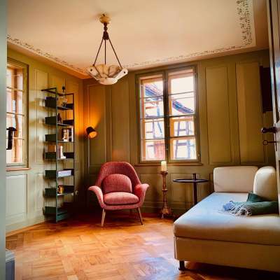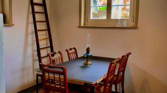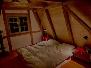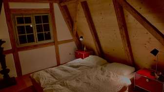 The Häxehüsli has just under 60 square meters of living space on three floors and can accommodate two people. The house is fully furnished with beautiful antiques and high-quality new furniture. The compact kitchen and a wood-burning stove are located in the historic vaulted cellar with plenty of natural light and an unobstructed view of the garden. In the Häxehüslistube, guests can let their gaze wander into the distance through the 170-year-old windows. In winter, the beautiful tiled stove provides cozy warmth. On the attic floor, a cozy bedroom with a separate work area is set up under the visible roof beams. A spacious shower and a WC with washbasin are available in the basement.