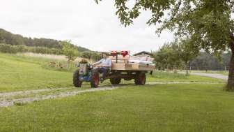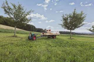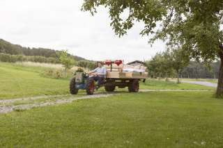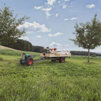 The single-axle trailer with a double bed can be parked on warm summer nights under your favorite apple tree on the Hagschnurer Hof farm in Hüttwilen. At this exceptional open-air location, with nothing but the apple tree and starry sky above you, you can experience the scents and colors of Thurgau's nature unfiltered and up close. Even light rain or uncertain weather will not spoil this special experience. It is now possible to simply stretch a transparent tarpaulin over the four-poster bed. There is also emergency accommodation for guests in the Schüür.
