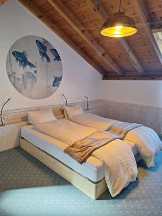 The Landgasthof Aachbrüggli in Erlen is beautifully furnished with attention to detail. The playful decoration, the flowery wallpaper and the concentrated female power of the owners exude charm and joie de vivre. The seven hotel rooms also reflect this and invite you to spend the night in the heart of Thurgau. Guests are delighted daily with a regional breakfast, one of the best barista coffees far and wide, daily fresh cakes and chocolate specialties, such as the famous "Schoggischümli". Fresh and seasonal lunches with local ingredients and drinks at a small bar are served every Tuesday and Friday. Every first Sunday of the month, breakfast is extended to a delicious brunch. Much of the food is homemade, such as the croissants or the Huusmüesli, and the rest comes from Erlen or the neighboring village. The sweet dessert temptations can be purchased in the store and taken home. During the summer, the Aachbrüggli team also runs the circus wagon with self-service coffee at the Neubauer organic nursery on the edge of the village.