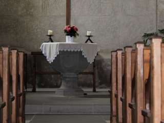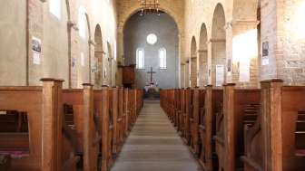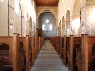 The church is a three-nave Romanesque basilica in the Lombard style. The northern aisle fell into disrepair due to the influence of the nearby Rhine and was demolished around 1600. The 13th century paintings on the triumphal arch have been preserved. The frescoes of St. Agatha (north wall), St. Sebastian (choir) and St. Anthony and Benedict (side apse) were created after 1500, the baptismal font in 1512. The pulpit dates from the 17th century. In the cloister there are tombstones of provosts from the 18th and 19th centuries, as well as a plague coffin with a hinged base: In 1611, half the population of Thurgau was carried off by the plague; 71 people in Wagenhausen. Three bells hang in the bell tower: a Marian bell from 1291, a large bell from 1514 and a small bell from 1953. The exterior of the church was restored in 1937 and the interior in 1950/51. In 1970/71, three apartments were set up in the east and south wings, and the historic Provost's Hall (parish hall) is also housed in the east wing.
