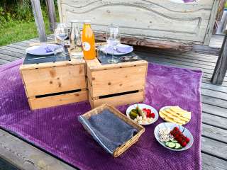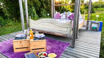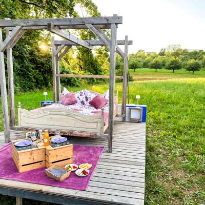 In a remote corner of the Thurgau, on the slopes of the Nollen, stands the Thurgau floating bed. And you really do float here - on a cloud of bliss. The cozy double bed, attached to a wooden frame, gently rocks guests to sleep, protected from view in the middle of nature under the open sky and with a wonderful view of the green expanses of the Thurgau. If you don't like rocking, attach the bed. The floating bed is located on the land of the Wunderli farm in Hosenruck. In bad weather, a canvas roof can be pulled out or you can switch to a room on the farm. A breakfast basket is included and can be served in bed on request. A welcome drink awaits guests on arrival and those who wish can also order a barbecue basket or raclette for dinner by the floating bed. Sanitary facilities are within walking distance.