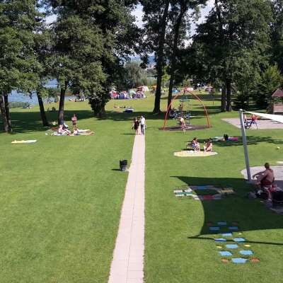 The 300-metre-long, park-like sunbathing lawn of the lido, with mature trees and right by the lake, invites you to linger and relax. The little ones also get their money's worth: a modern children's pool and numerous play facilities offer young families a welcome break from everyday life. Practical: the bathing area includes a fire pit and a large parking lot. And there is a nice restaurant right next to the sunbathing lawn.
